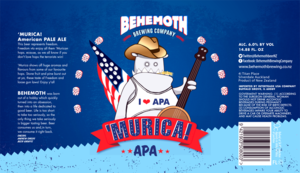Behemoth Murica American Pale Ale. This beer represents freedom. ‘Murica shows off huge aromas and flavors from some of our favorite hops. Stone fruit and pine burst out at ya, these taste of Freedom and loose gun laws! American Pale Ales are light in color, ranging from golden to a light copper color. The style of this beer is defined by the American hops used. American hops typically have high bitterness and aroma. This is a perfect beer for big fare like grilled burgers or combination pizzas, as well as lighter fare like sushi and green salads.