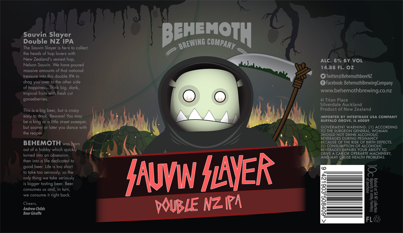 Behemoth Sauvin Slayer Double NZ IPA. The Sauvin Slayer is here to collect the heads of hop lovers with New Zealand’s sexiest hop, Nelson Sauvin. We have poured massive amounts of that national treasure into this double IPA to drag you over to the other side of hoppiness. Think big, dank, tropical fruits with fresh cut gooseberries. This is a big beer, but is crazy easy to drink. Beware! You may be a king or a little street sweeper, but sooner or later you dance with the reaper.