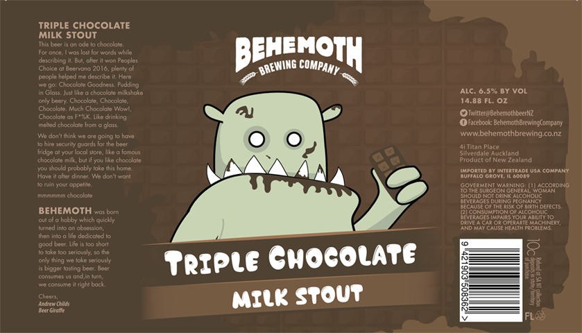 Behemoth Triple Chocolate Milk Stout. This beer is an ode to chocolate. For once, I was lost for words while describing it. But, after it won People’s Choice at Beervana 2016, plenty of people helped me describe it. Here we go: Chocolate Goodness. Pudding in Glass. Just like a chocolate milkshake only beery. Chocolate, Chocolate, Chocolate. Much Chocolate Wow! Like drinking melted chocolate from a glass. We don’t think we are going to have to hire security guards for the beer fridge at your local store, like a famous chocolate milk, but if you like chocolate you should probably take this home. Have it after dinner. We don’t want to ruin your appetite.