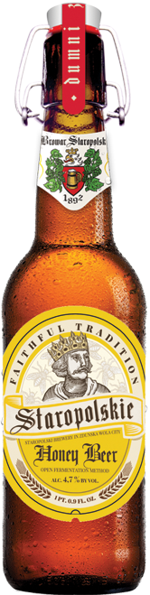 Staropolskie Honey is a beer with a unique taste, brewed using a double dose of natural honey. The combination of knowledge of Old Polish brewers and miodosytników. Honey beer, bright, pasteurized. Ingredients: water, malts: Pilsen; hops: Magnum, Hallertauer Tradition; natural honey (60g / liter), yeast bottom fermentation.